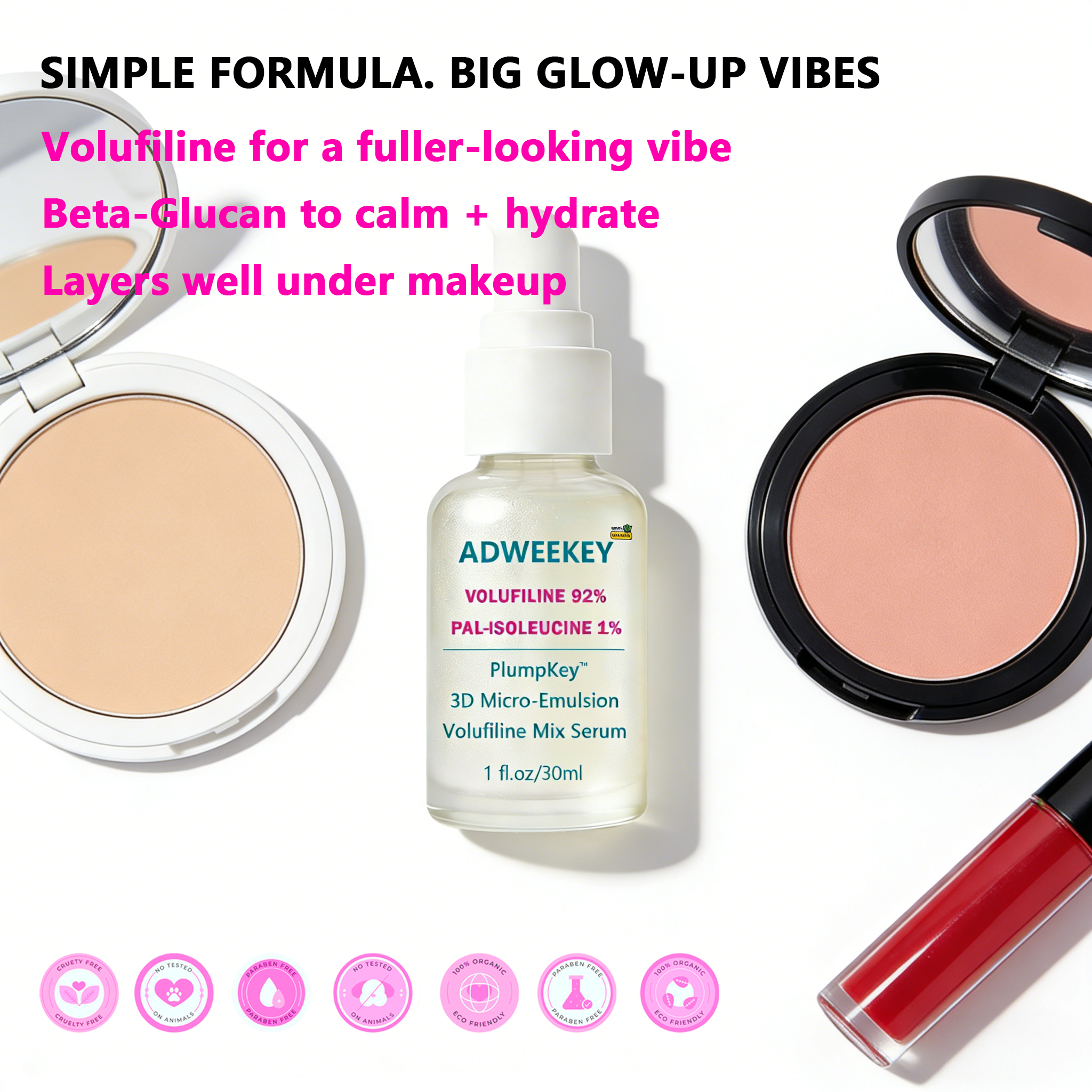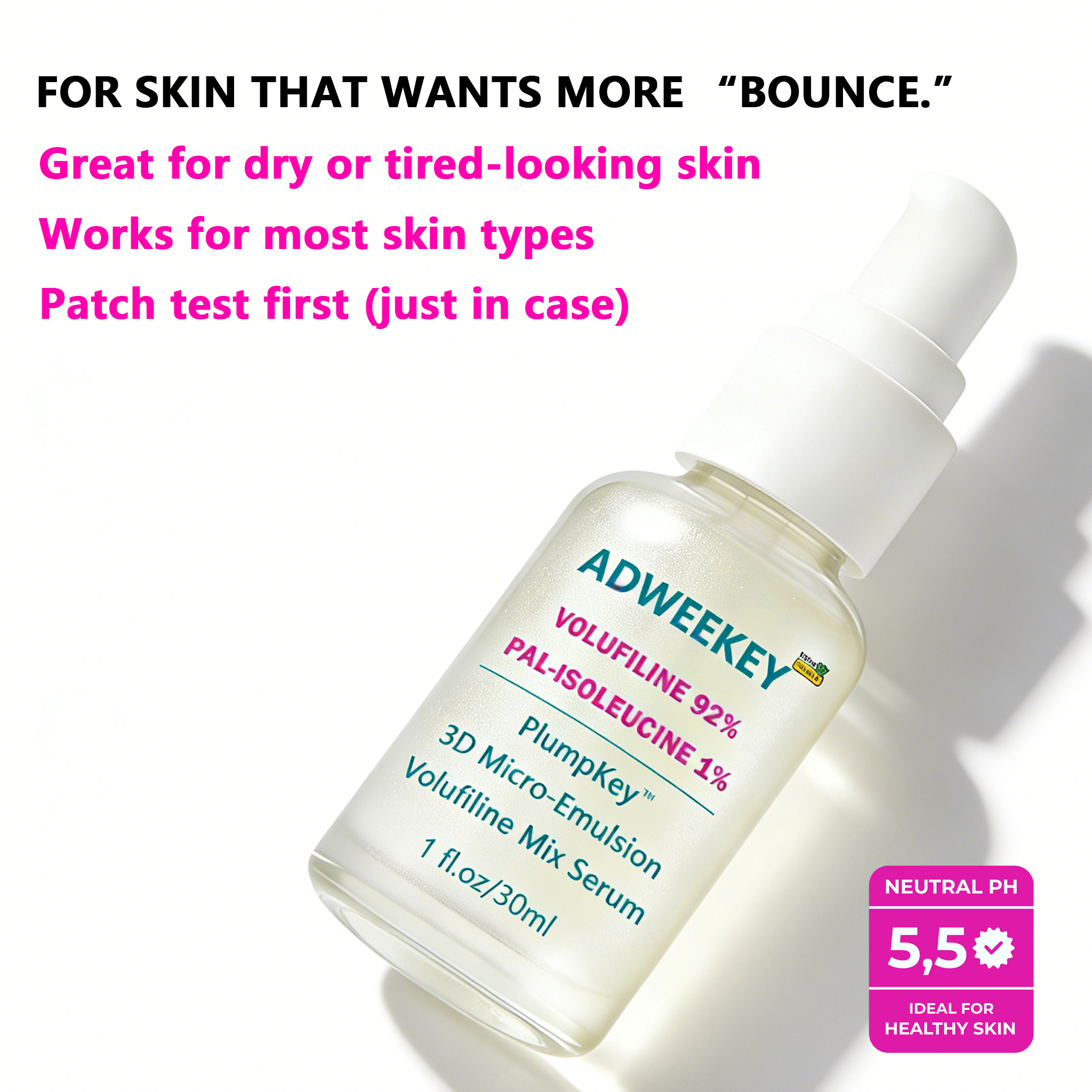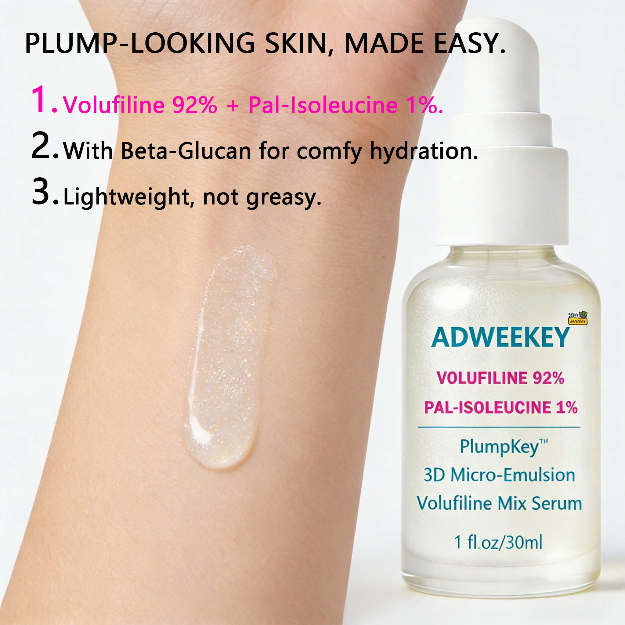 Meet your new “bounce booster” for everyday skin goals. ADWEEKEY Volufiline 92% + Pal-Isoleucine 1%+Beta-Glucan Serum is made with PlumpKey 3D Micro-Emulsion texture—lightweight, smooth, and easy to layer. It’s designed to help skin look plumper, softer, and more elastic, while keeping the finish comfortable (no greasy shine, no sticky film). Why you’ll love it Plump-looking glow: Supports a bouncy, healthy-looking appearance Comfort hydration: Beta-Glucan helps soothe the look of dryness Makeup-friendly: Sits nicely under moisturizer and makeup Airless pump packaging: Clean dispensing + consistent dosing How to use After cleansing, apply 1–2 pumps to face and neck AM & PM. Follow with moisturizer. In the morning, finish with sunscreen. What’s inside Volufiline 92% Pal-Isoleucine 1% PlumpKey 3D Micro-Emulsion Beta-Glucan Serum Size: 1 fl oz / 30 mL (airless pump) Disclaimer: Cosmetic product for external use only. Avoid direct contact with eyes. Patch test before first use. Discontinue use if irritation occurs. Results may vary.